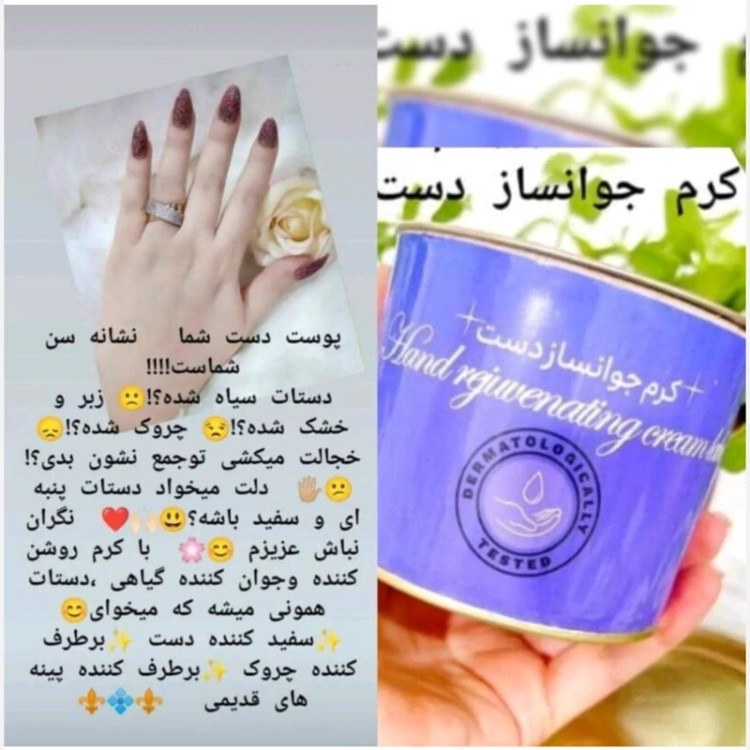 پوست دست وصورت شما نشانه سن شماست!!!! دستات سیاه شده؟! زبر و خشک شده؟! چروک شده؟! خجالت میکشی توجمع نشون بدی؟! دلت میخواد دستات پنبه ای و سفید باشه؟نگران نباش عزیزم با #کرم روشن کننده وجوان کننده گیاهی ،دستات همونی میشه کهمیخوای😉 مثل همیشه محصولات ما عالی و بینظیر ✨سفید کننده دست ✨برطرف کننده چروک ✨برطرف کننده پینه های سیاه ✨نرم کننده. جوانساز ابریشم