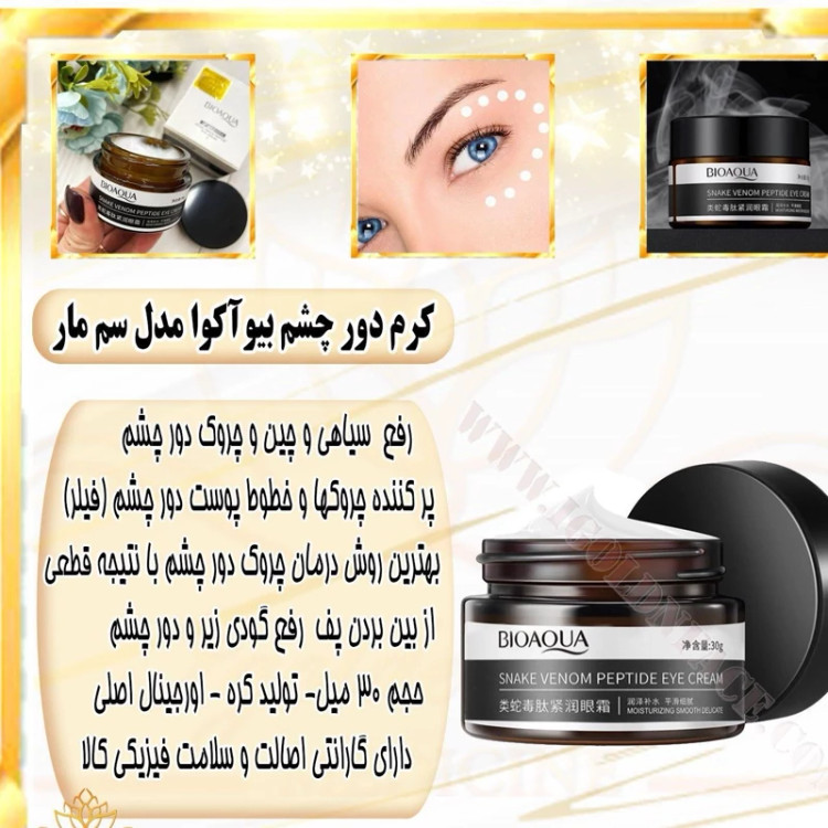 کرم دور چشم سم مار بیوآکوا ضدتیرگی وپف دور چشم وازبین بردن چین وچروک دور چشم